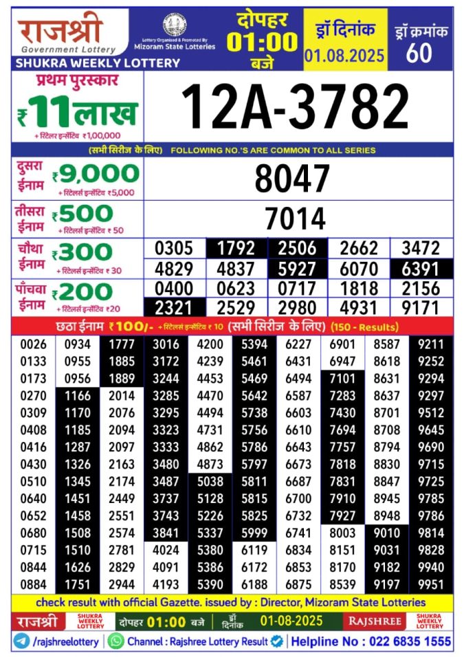 Rajshree Shukra Weekly Lottery 1pm Result 01.08.2025