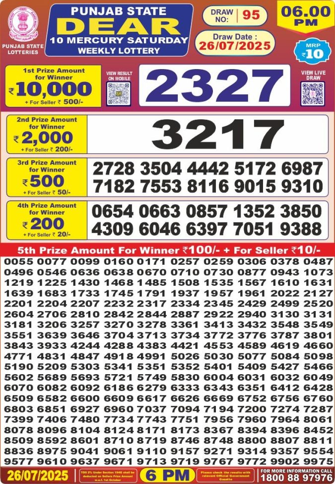 Punjab state dear 10 6pm lottery result 26.07.2025