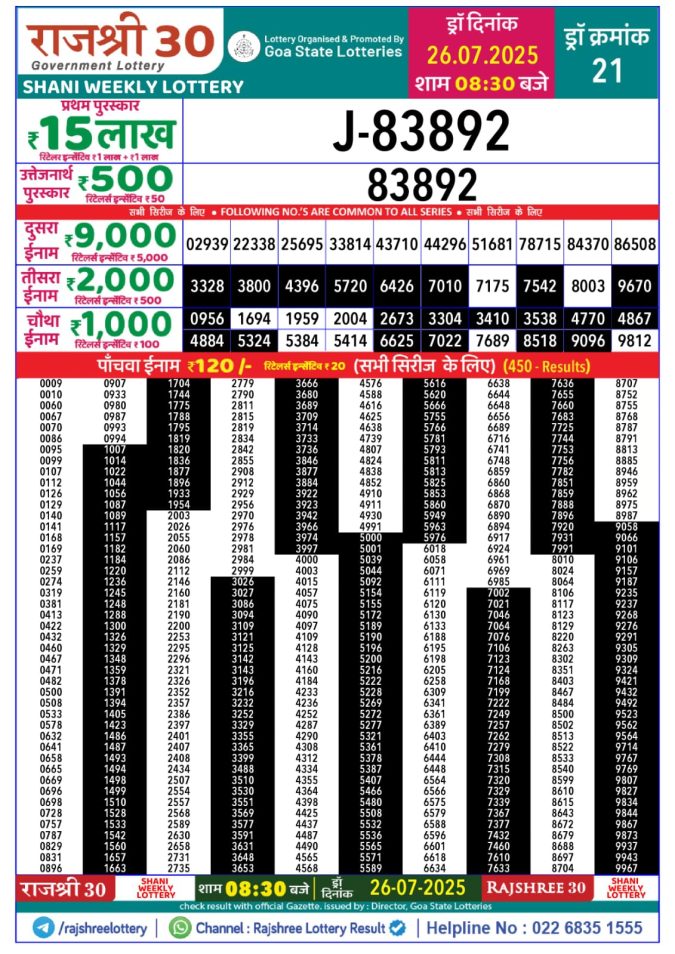 Rajshree 30 Lottery 8:30PM Result 26.07.2025
