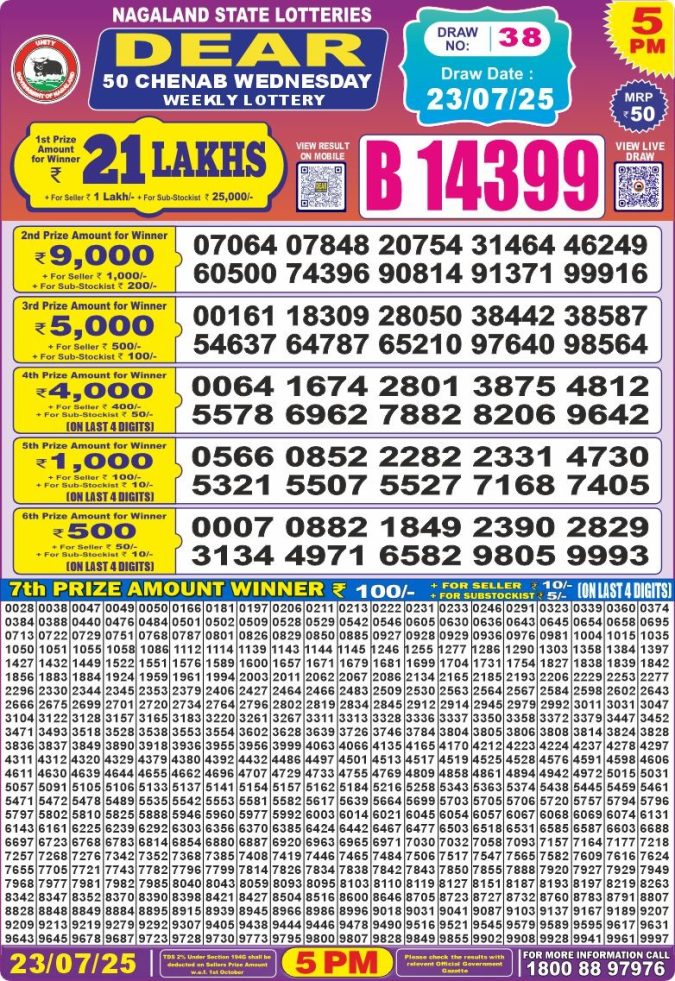 Dear 50 Chenab 5pm Wednesday Lottery Result 23.07.2025