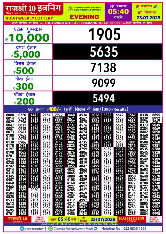 Rajshree 10 evening Wednesday 5:40pm Lottery result 23.07.2025