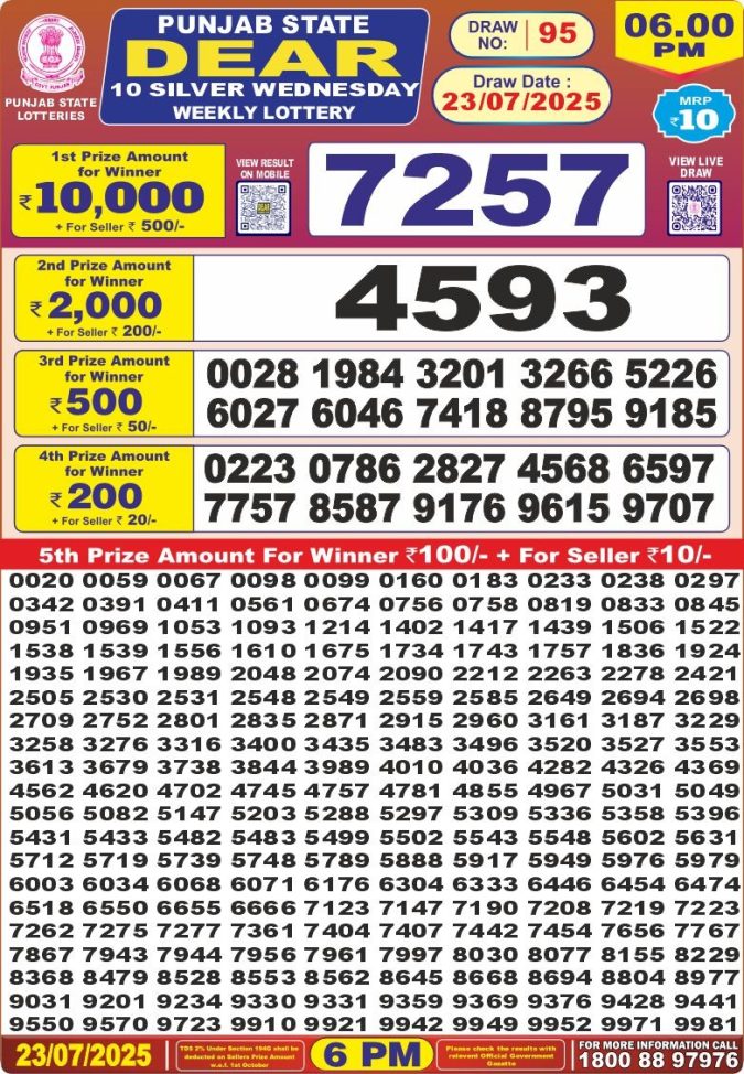 Punjab state dear 10 6pm lottery result 23.07.2025