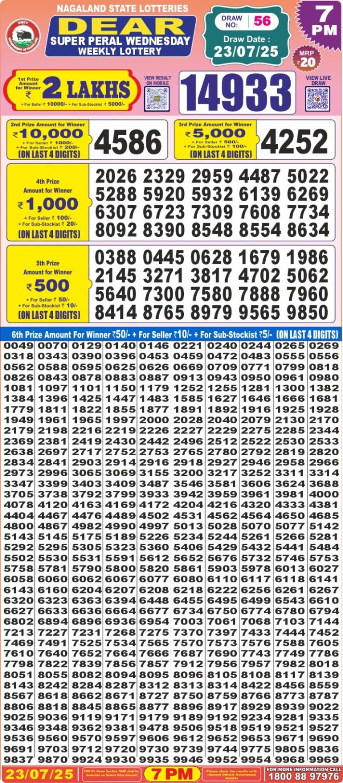 Dear Super Peral Lottery 7pm result 23.07.2025