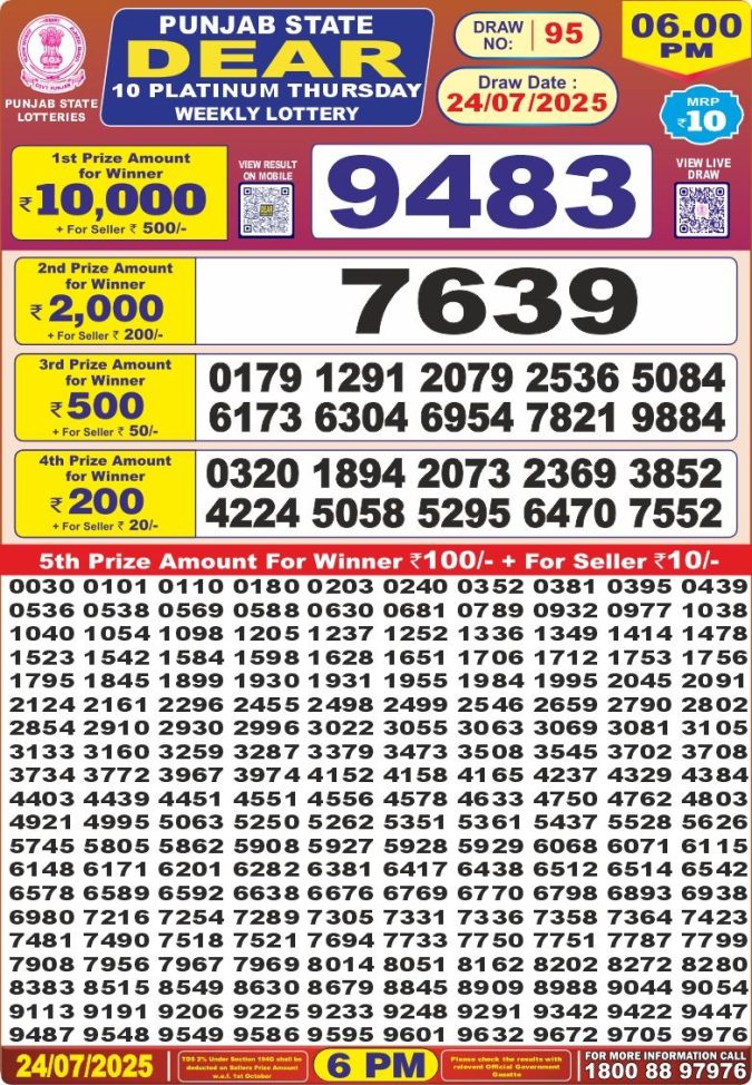 Punjab state dear 10 6pm lottery result 24.07.2025
