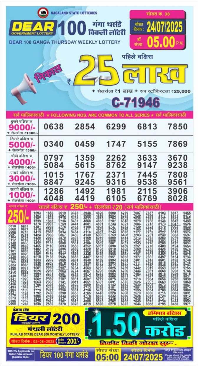 Dear 100 Ganga Thursday Lottery 5pm Result  24.07.2025
