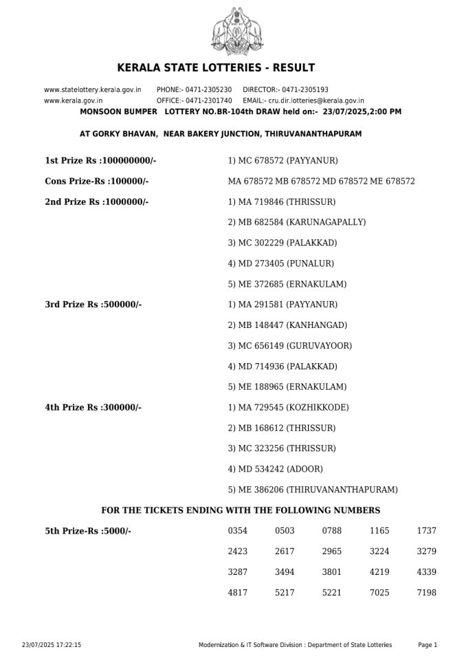 Kerala Lottery Result MONSOON BUMPER BR 104 3PM Today 23.07.2025