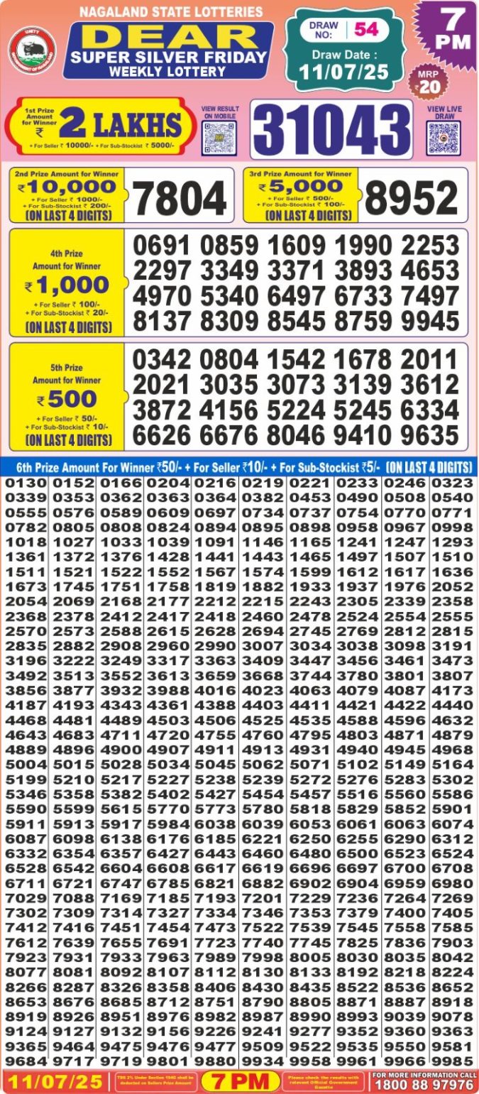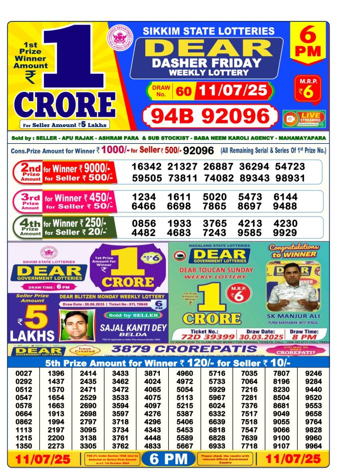 Dear dasher Friday weekly 6PM Result 11.07.2025