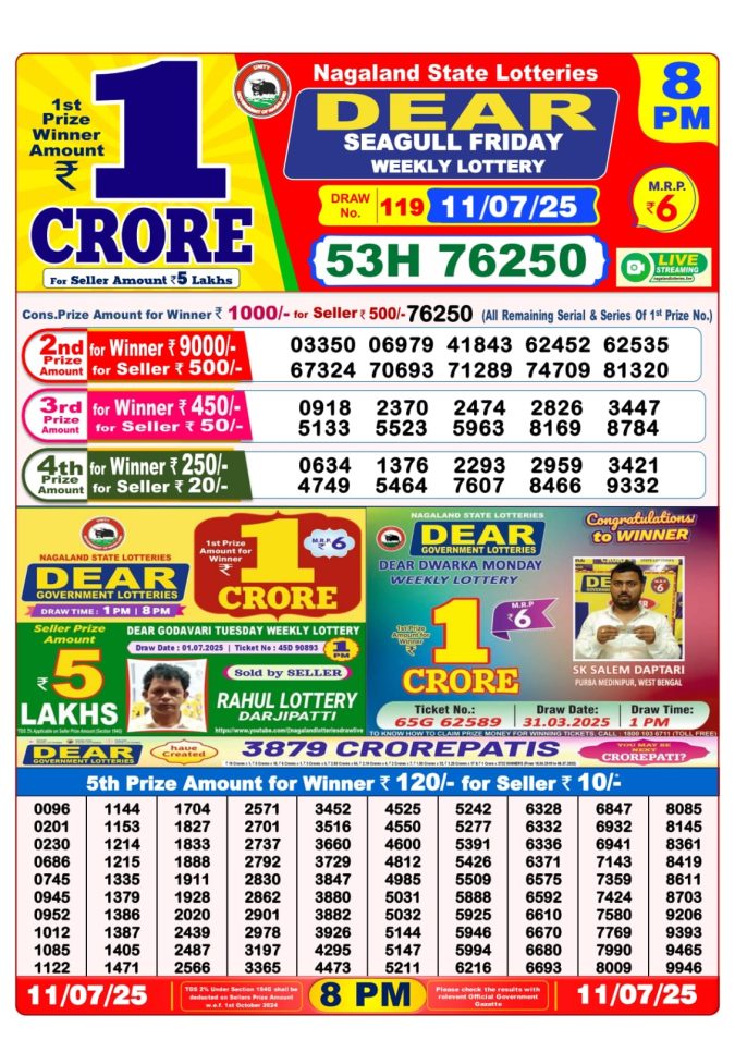 Dear seagull Weekly Lottery 8PM Result 11.07.2025