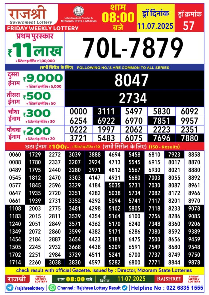 Rajshree Weekly Lottery 8PM Result 11.07.2025