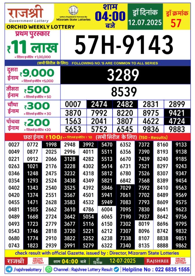 Rajshree orchid Saturday Weekly Lottery 4PM Result 12.07.2025