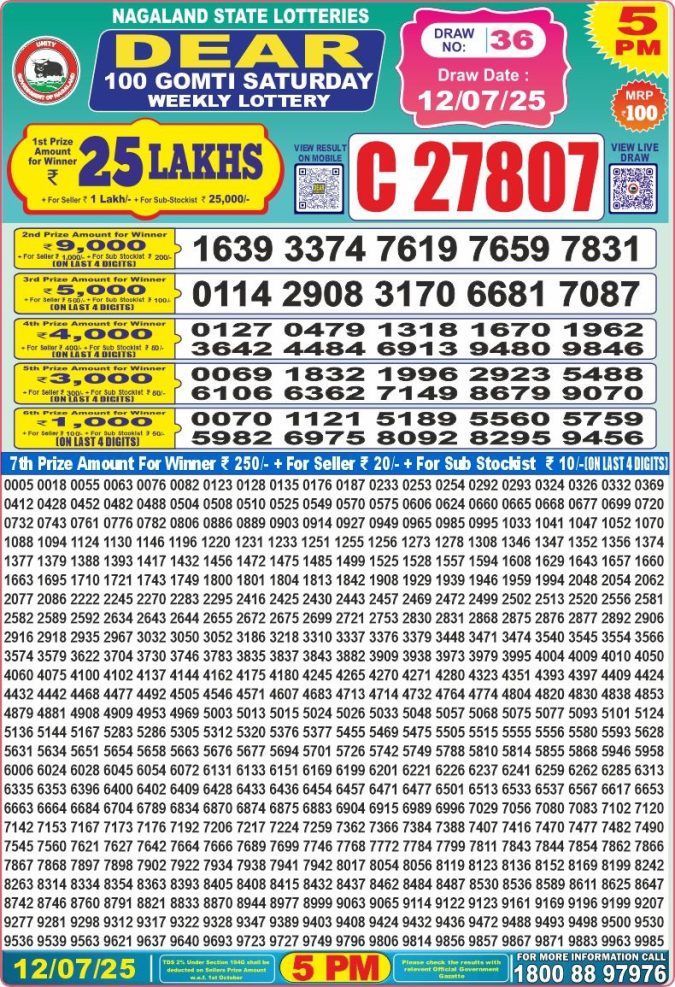 Dear 100 Gomti saturday Lottery 5pm Result  12.07.2025