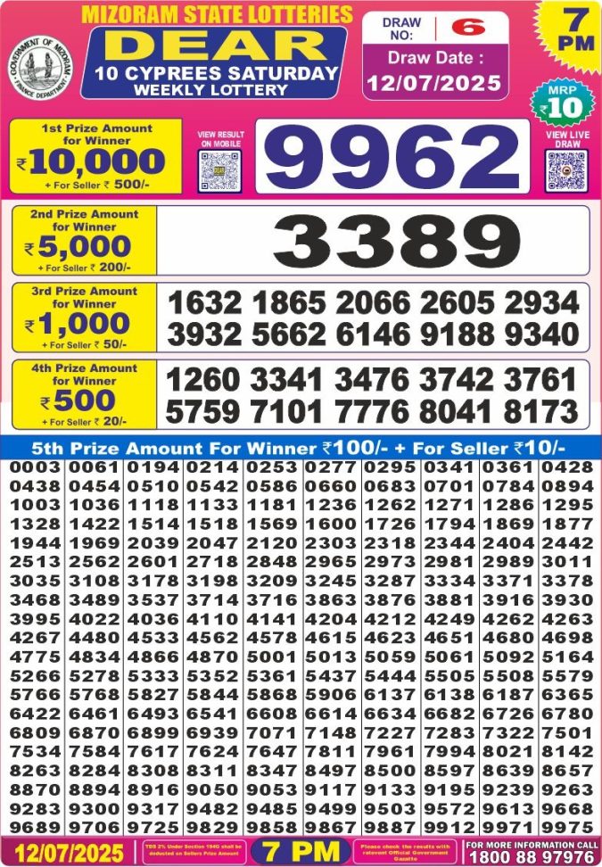 Punjab state dear 10 6pm lottery result 12.07.2025