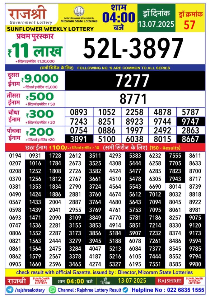 Rajshree sunflower sunday Weekly Lottery 4PM Result 13.07.2025