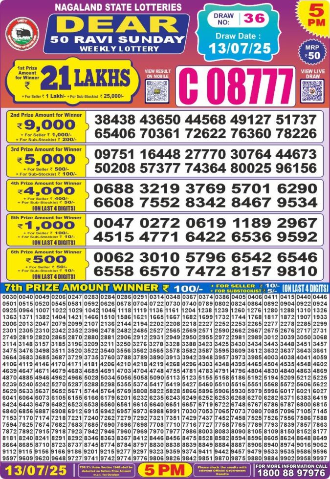 Dear 50 ravi saturday Lottery 5pm Result  13.07.2025