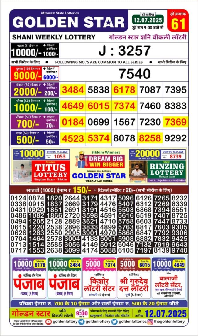 Golden Star weekly Lottery result 9pm 11.07.2025