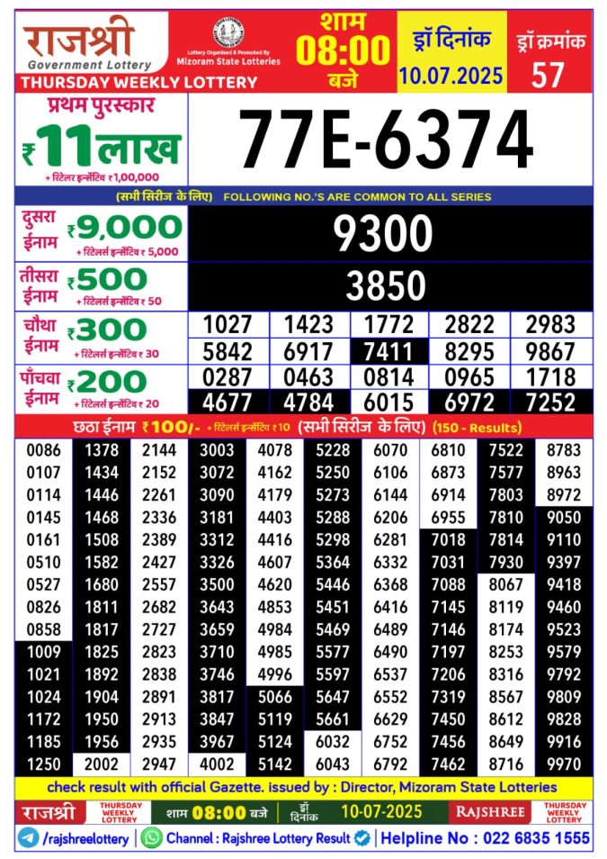 Rajshree Lotus Thursday Weekly Lottery 4PM Result 10.07.2025