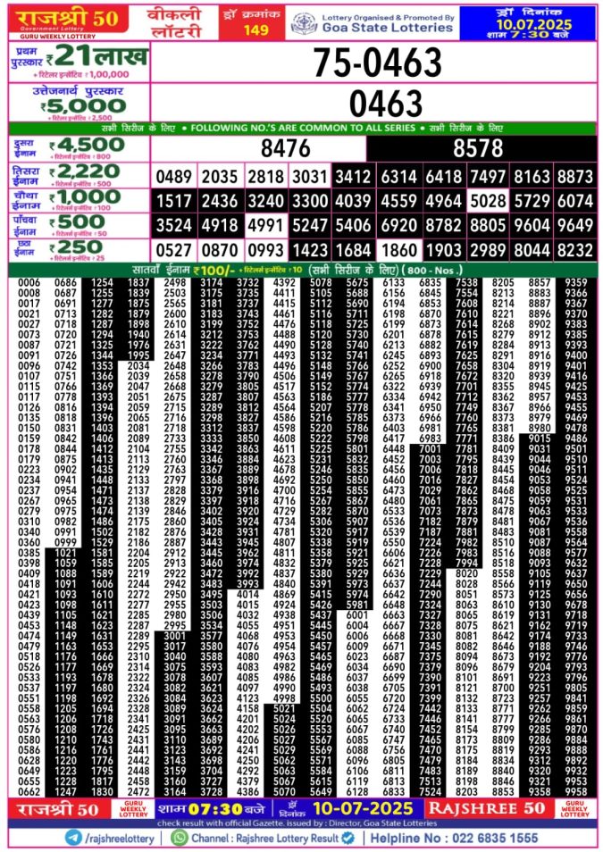 Rajshree 50 Lottery 7:30PM Result 10.07.2025