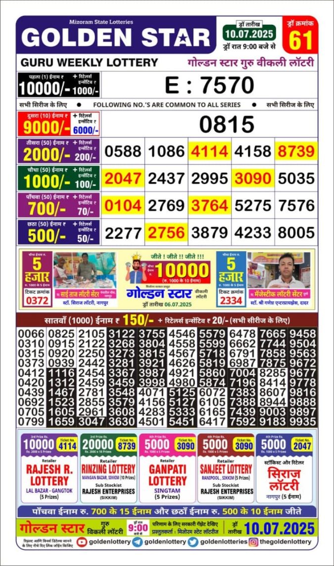 Golden Star weekly Lottery result 9pm 10.07.2025