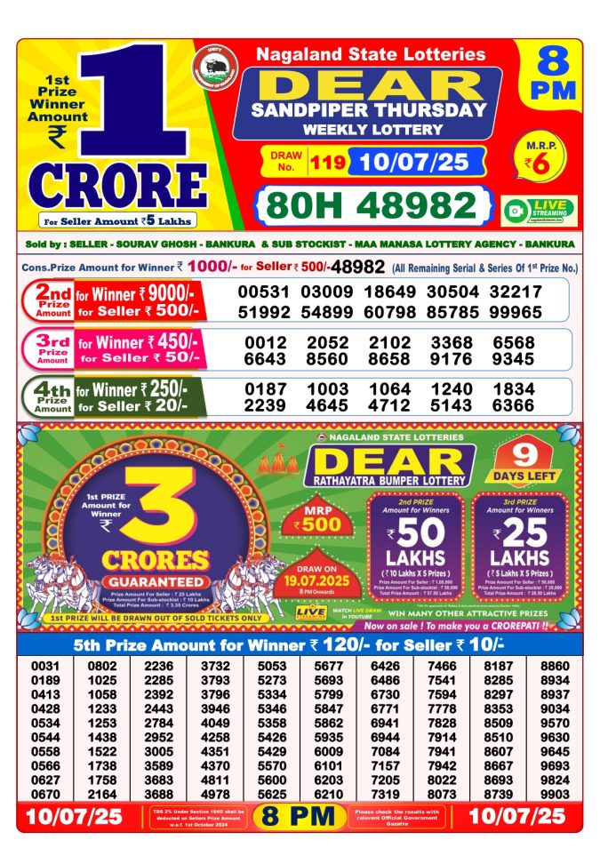 Dear Sandpiper Thursday Weekly Lottery 8PM Result 10.07.2025