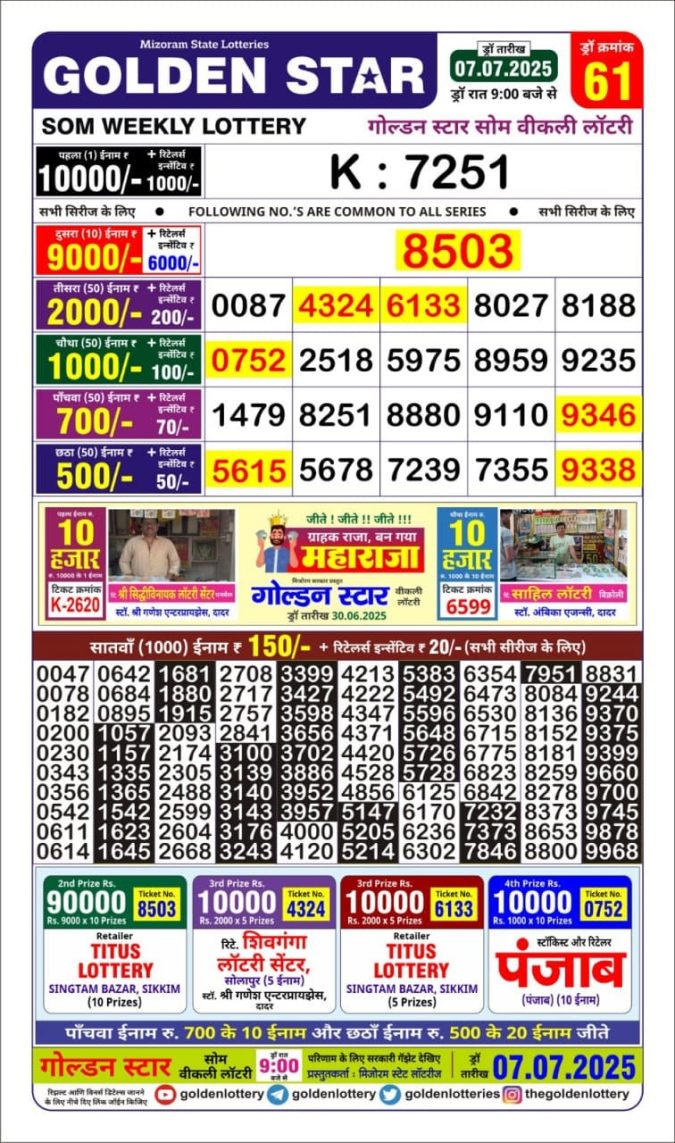 Golden Star weekly Lottery result 9pm 07.07.2025