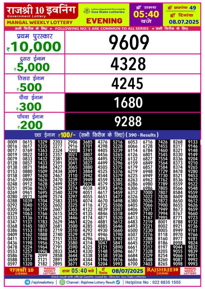 Rajshree 10 evening tuesday 5:40pm result 08.07.2025