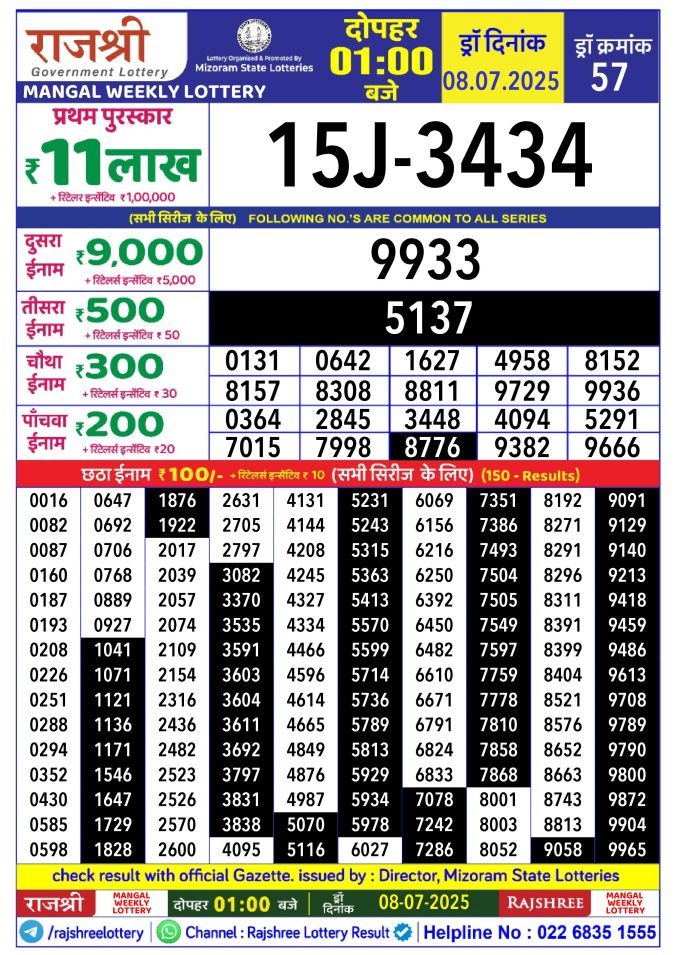 Rajshree mangal  Weekly Lottery 1PM Result 08.07.2025