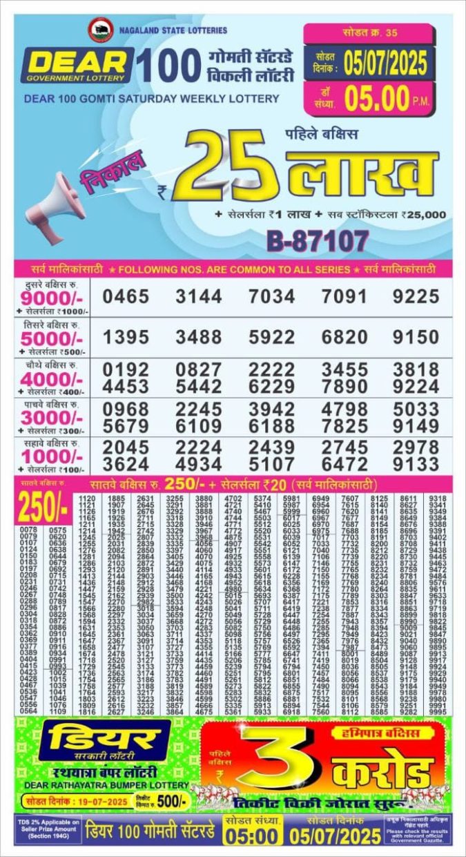 Dear 100 Gomti saturday Lottery 5pm Result  05.07.2025