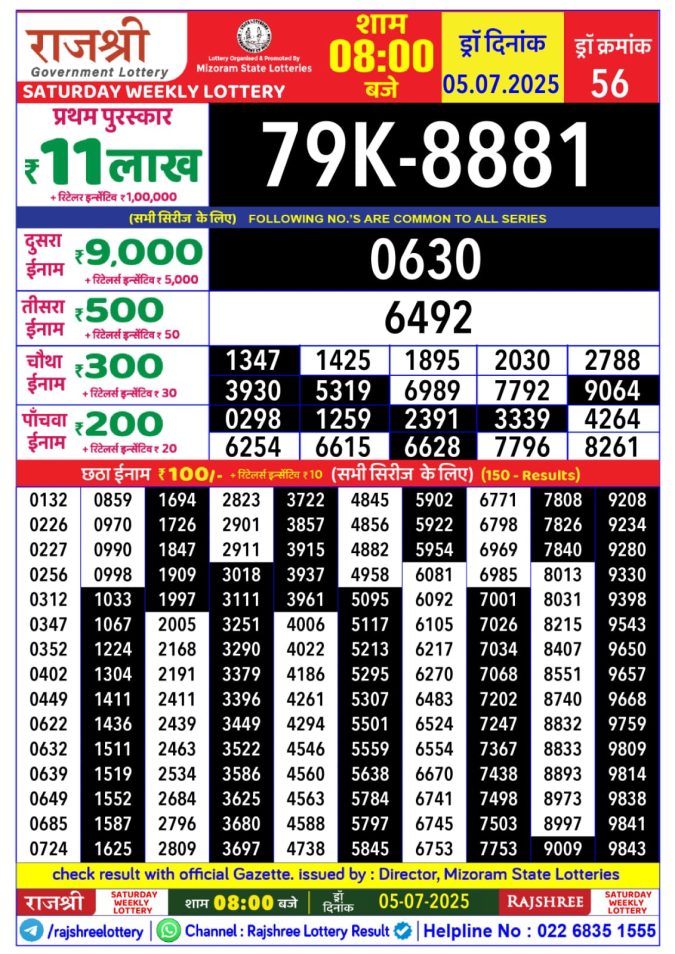 Rajshree Weekly Lottery 8PM Result 05.07.2025