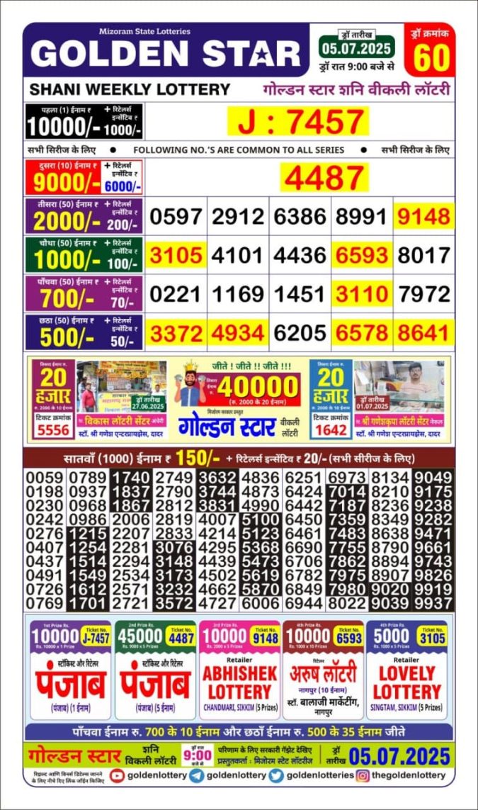 Golden Star weekly Lottery result 9pm 04.07.2025