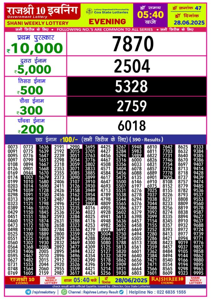 Rajshree 10 evening Saturday 5:40pm result 28.06.2025