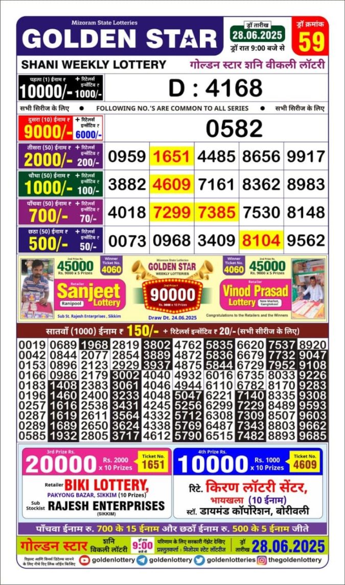 Golden Star weekly Lottery result 9pm 28.06.2025