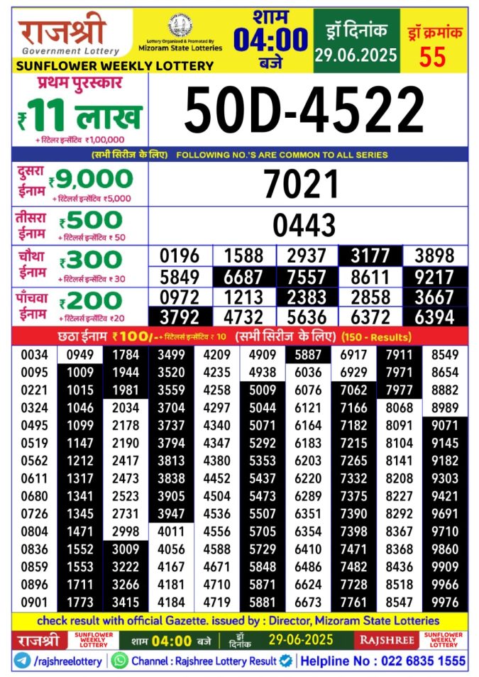 Rajshree sunflower sunday Weekly Lottery 4PM Result 29.06.2025