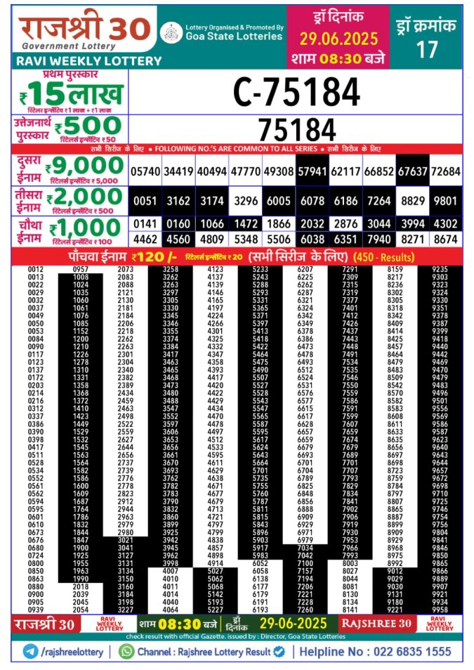 Rajshree Weekly Lottery 8PM Result 29.06.2025