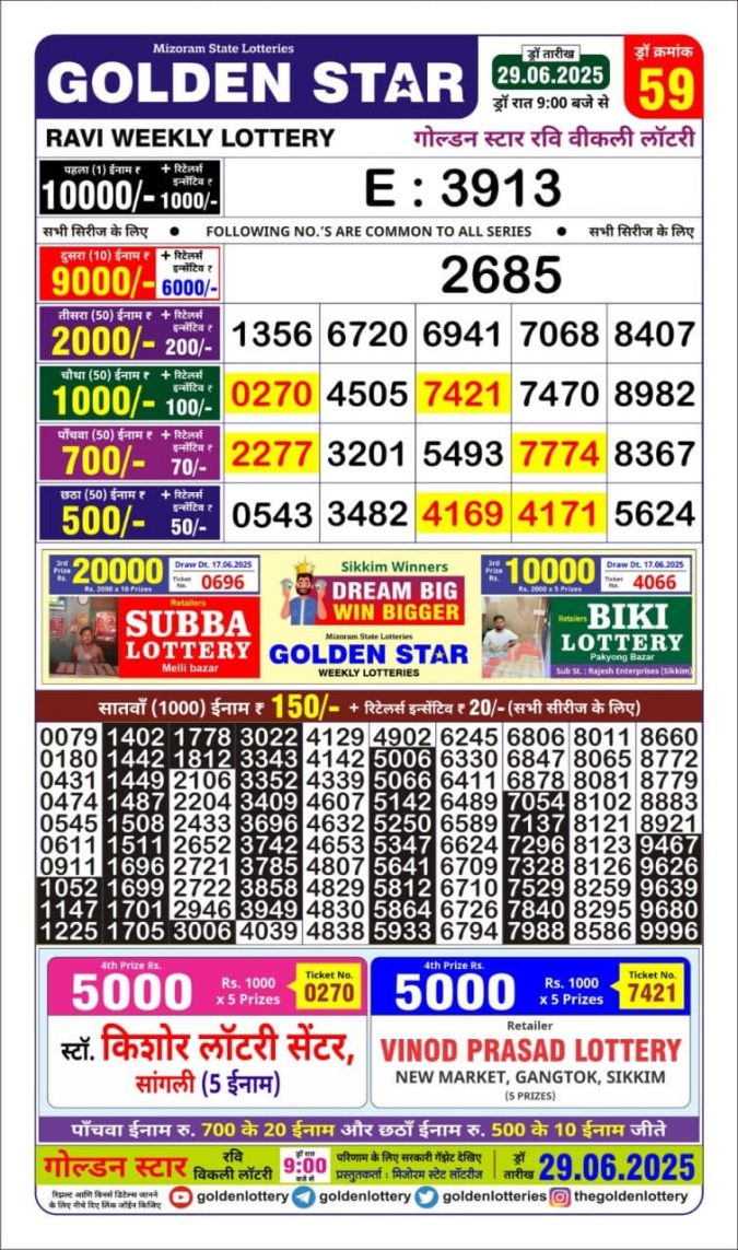 Golden Star weekly Lottery result 9pm 29.06.2025