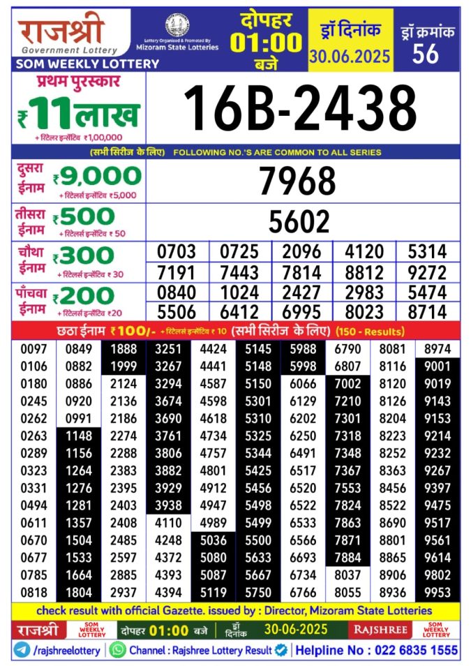 Rajshree som Weekly Lottery 1PM Result 30.06.2025