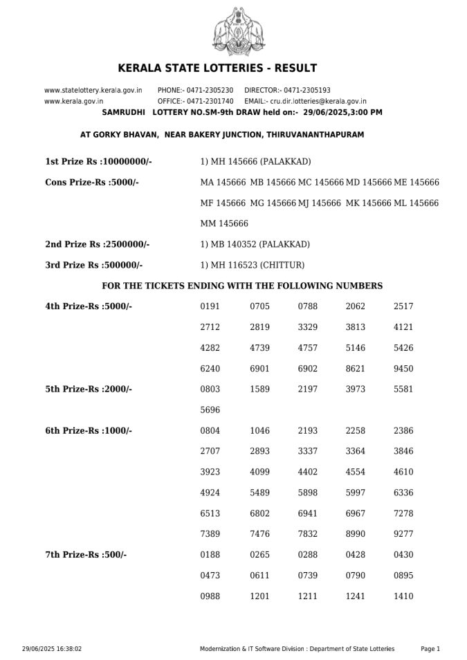 Kerala Lottery Result SM 9 3PM Today 29.06.2025