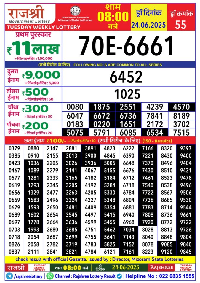 Rajshree Weekly Lottery 8PM Result 25.06.2025