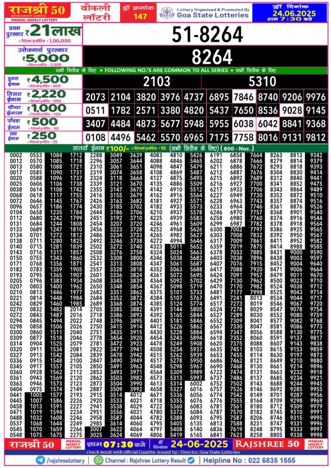 Rajshree 50 Lottery 7:30PM Result 24.06.2025