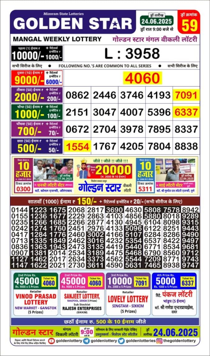 Golden Star weekly Lottery result 9pm 24.06.2025