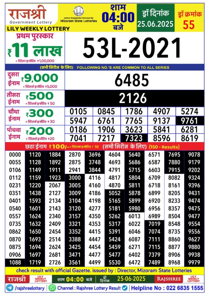 Rajshree Lily Wednesday Weekly Lottery 4PM Result 25.06.2025