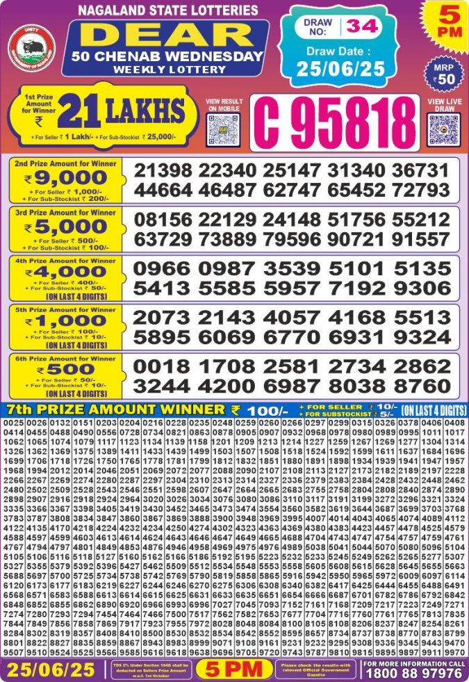 Dear 50 Chenab 5pm Wednesday Lottery Result 25.06.2025