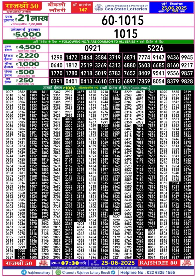 Rajshree Budh Weekly Lottery 1PM Result 25.06.2025