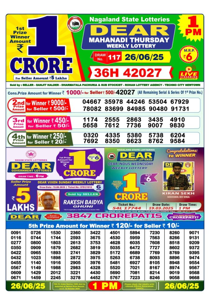 Dear mahanadi Thursday Weekly 1pm result 26.06.2025