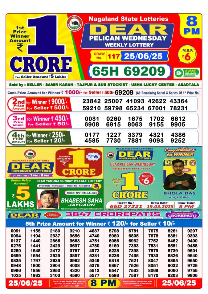 Dear pelican Weekly Lottery 8PM Result 25.06.2025
