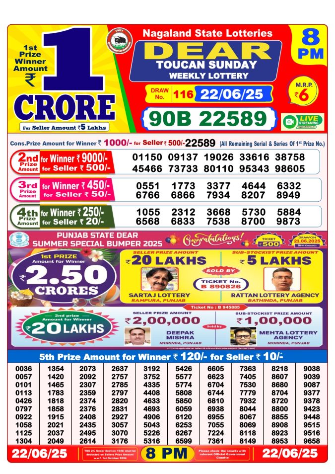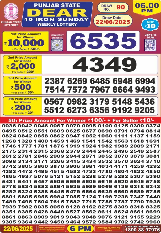 Punjab state dear 10 6pm lottery result 22.06.2025