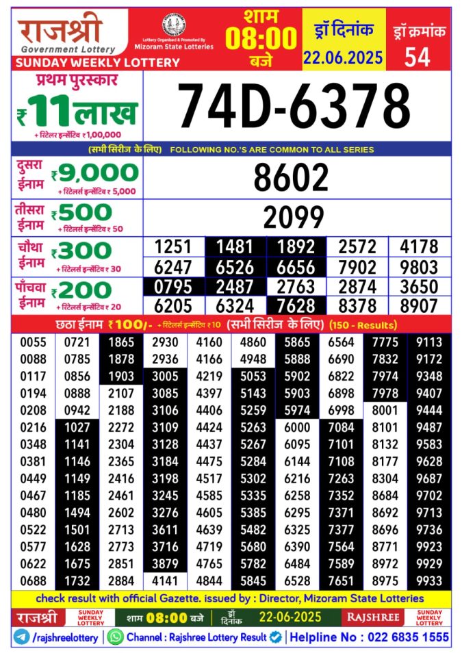 Rajshree Weekly Lottery 8PM Result 22.06.2025