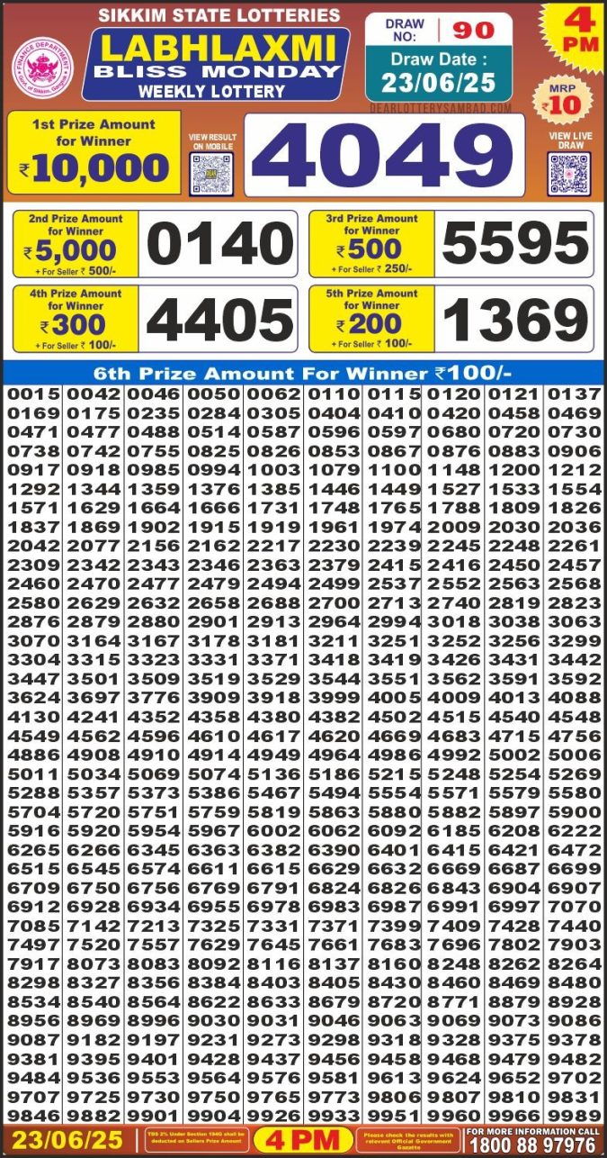 Dear 10 blue lottery 1.30PM Result 23.06.2025