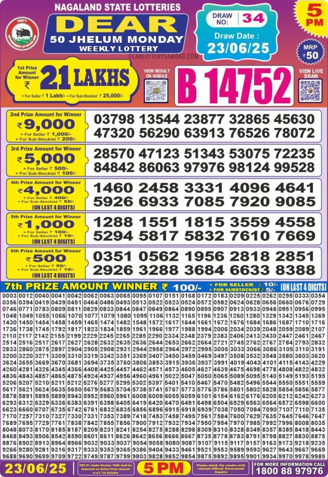 Dear 50 jhelum monday Lottery 5pm Result  23.06.2025