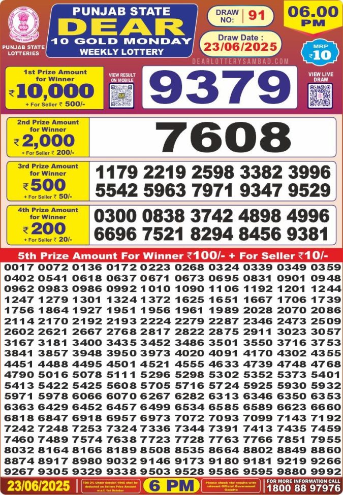 Punjab state dear 10 6pm lottery result 23.06.2025