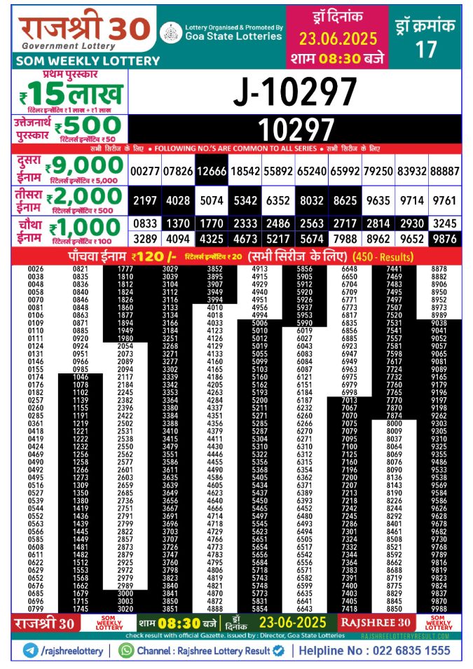 Rajshree som Weekly Lottery 1PM Result 23.06.2025